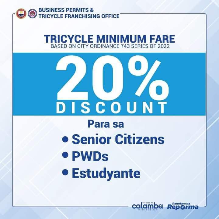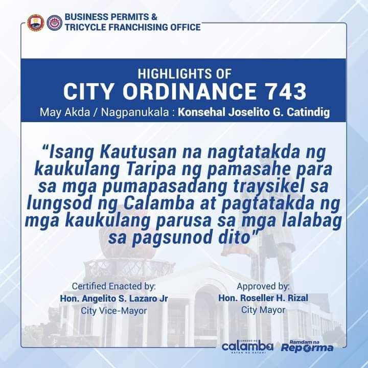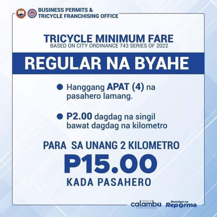 Anunsyo para sa publiko sa Calamba City, LAGUNA na ang City Ordinance No. 743 na nagtatakda ng taripa ng dapat singiling pamasahe sa lahat ng bumibiyaheng traysikel sa Lungsod ng Calamba ay paiiralin simula NOBYEMBRE 5, 2022. Click lang ang link para sa iba pang detalye