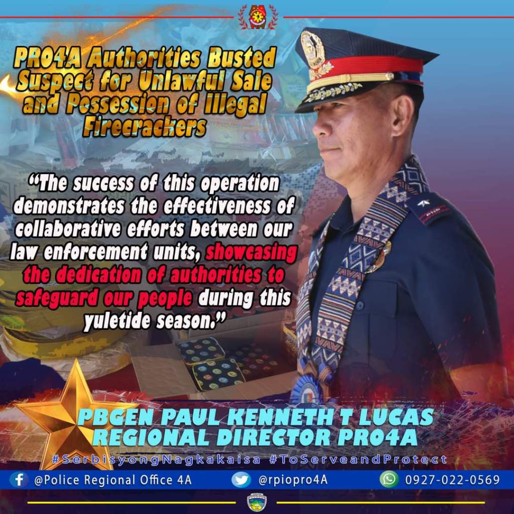 “The Police Regional Office CALABARZON under my command is committed to ensuring the safety of the public, especially during the holiday season when the use of firecrackers tends to surge,” PBGEN PAUL KENNETH T LUCAS in his statement.
