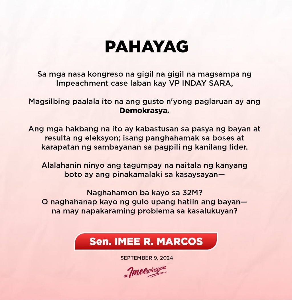 Nagpahayag ng mariing babala si Senador Imee Marcos laban sa mga mambabatas sa Kongreso na tila pursigido sa pagsampa ng impeachment case laban kay Pangalawang Pangulo Sara Duterte. Ayon kay Marcos, ang ganitong hakbang ay isang pagsubok sa demokrasya at kabastusan sa mandato ng bayan.