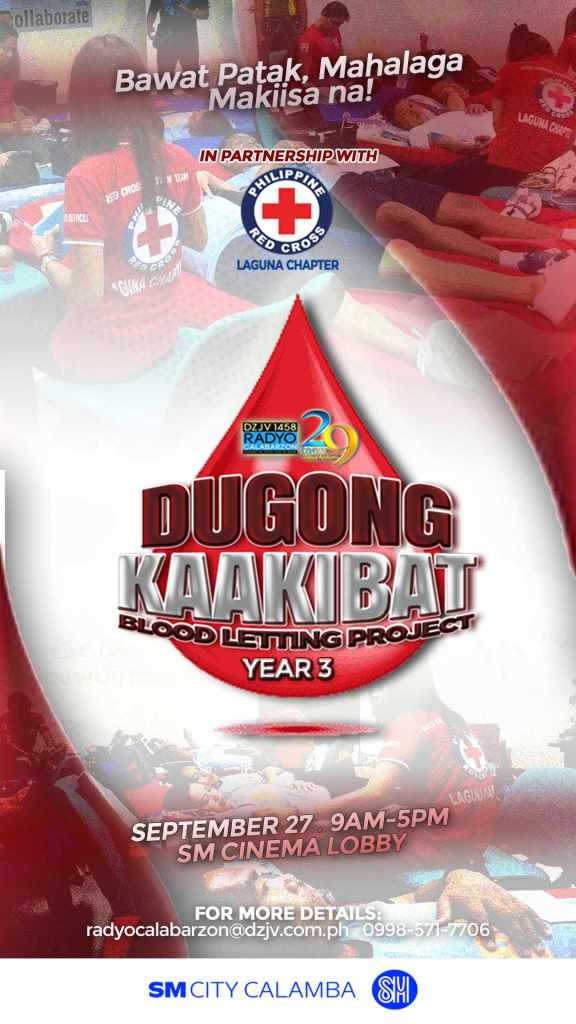 Calamba City, Laguna – The Philippine Red Cross, Laguna Chapter, in partnership with DZJV 1458 Radyo CALABARZON, proudly announces the third annual Dugong Kaakibat Blood Letting Project. The event, titled “Bawat Patak Mahalaga, Makiisa na!”, will take place on September 27, 2024, from 9 AM to 5 PM at the SM Cinema Lobby, SM Calamba.