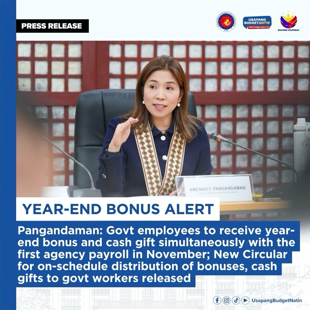 Pangandaman: Govt employees to receive year-end bonus and cash gift simultaneously with the first agency payroll in November; New Circular for on-schedule distribution of bonuses, cash gifts to govt workers released