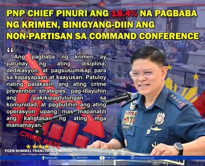 The Philippine National Police (PNP) successfully concluded a high-level Command Conference on March 25, 2025, at the PNP Main Conference in Camp Crame. The meeting, presided over by PNP Chief Police General Rommel Francisco D Marbil, was attended by members of the Command Group, Directorial Staff, and Chiefs of National Support Units (NSUs), with all Regional Directors of Police Regional Offices (PROs) nationwide joining via Zoom.