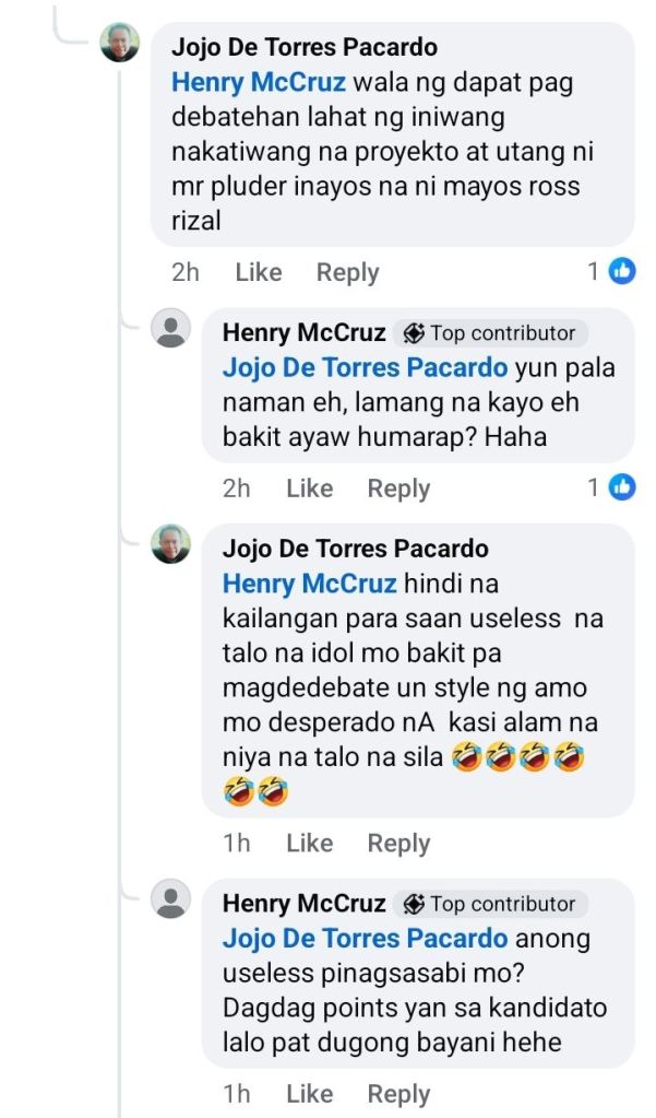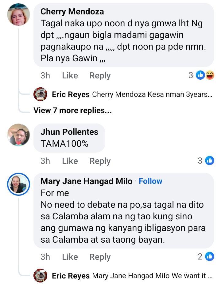 “He’s asking for a debate, but he’s only good at speaking and lacks action. Enough is enough. You’ve held Calamba for almost 2 decade—both in the LGU and in Congress—and all we saw were words, self-promotion, and personal interests,” said a concerned citizen from Calamba.