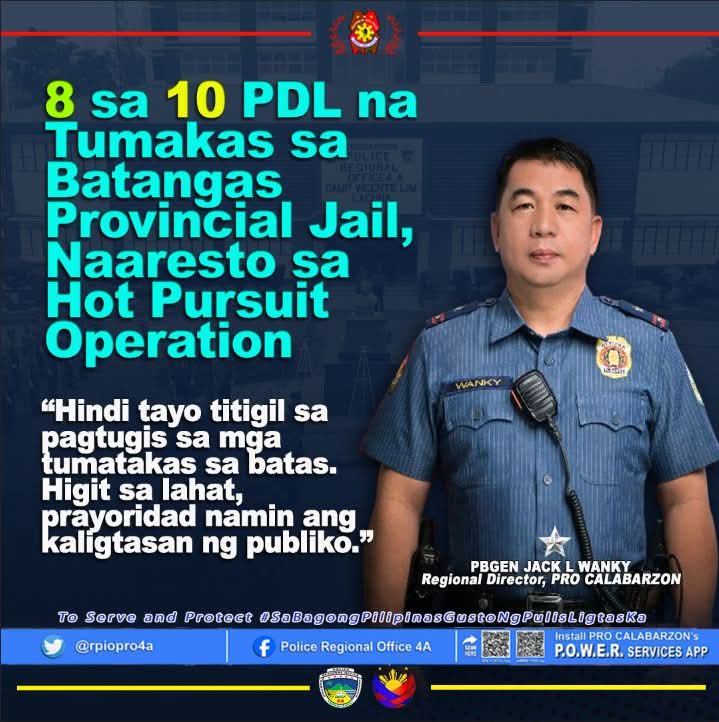 Camp BGen Vicente P. Lim, Batangas – Eight out of ten persons deprived of liberty (PDLs) who escaped from the Batangas Provincial Jail were successfully recaptured in a swift and coordinated hot pursuit operation conducted by the Sto. Tomas Component City Police Station (CCPS) and Ibaan Municipal Police Station on Monday, July 28, 2025.