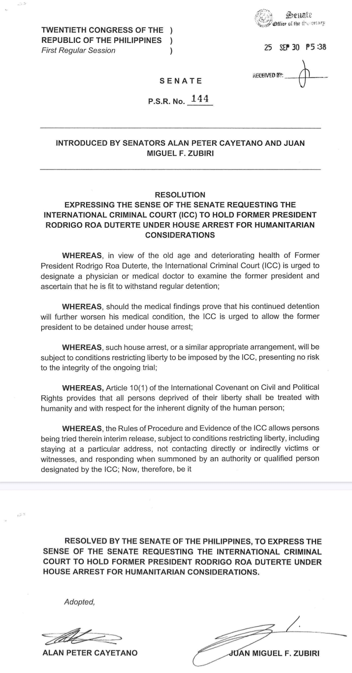 Pinagtibay nito ang mga katulad na resolusyon na naunang inihain sa 20th Congress ng Minority senators na nananawagan sa gobyerno na pormal na hingin sa ICC na bigyan si Duterte ng interim release sa pamamagitan ng house arrest para sa humanitarian grounds, kabilang ang Senate Resolution No.17 na inihain ni Cayetano nitong Hulyo.
