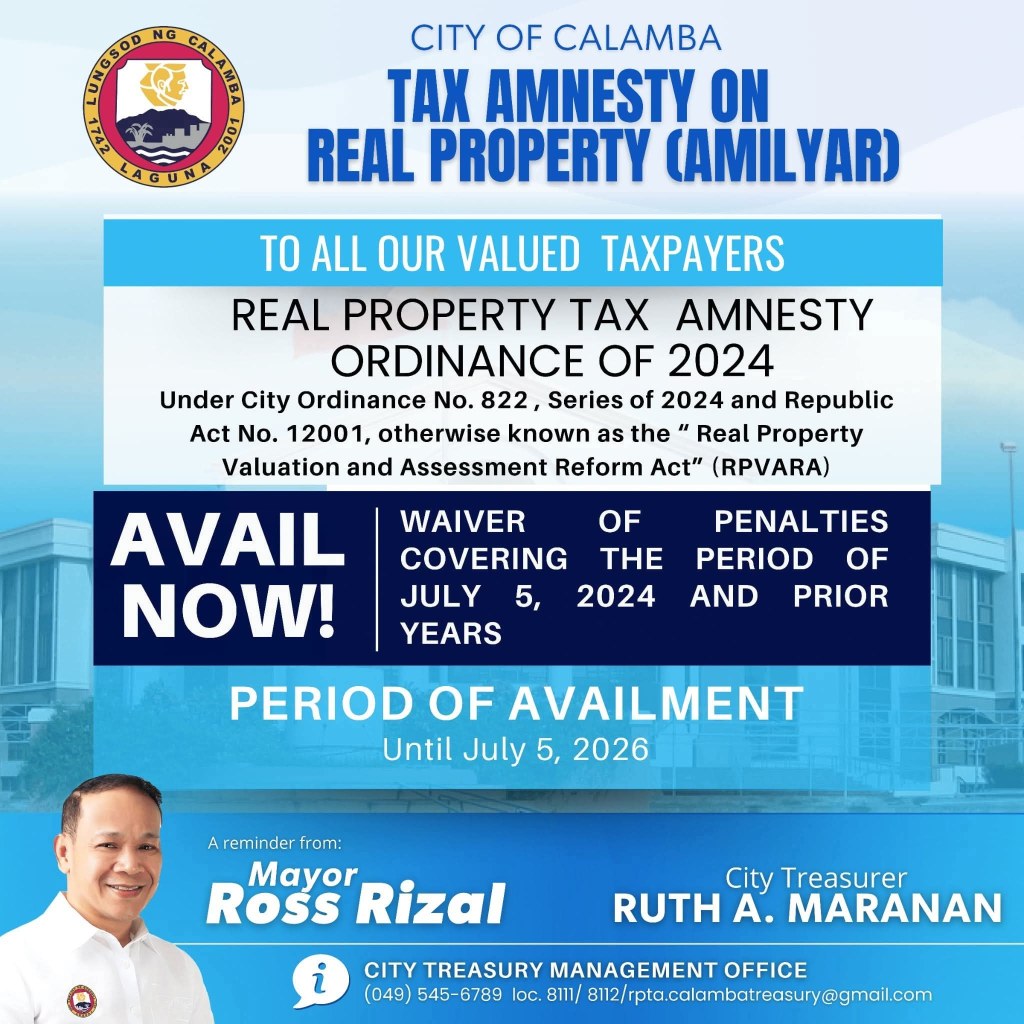 Paalala para sa lahat ng taxpayers, sa bisa ng City Ordinance No. 822, Series of 2024 at RA 12001 (RPVARA), ipinatutupad ang Real Property Tax Amnesty para sa mga amilyar na hindi nabayaran hanggang July 5, 2024 at mga nakaraan pang taon.