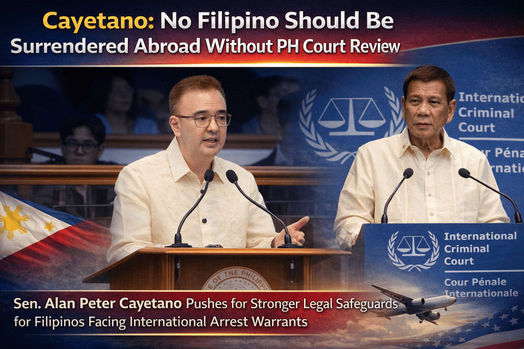 Senate Minority Leader Alan Peter Cayetano on Wednesday pushed for stronger safeguards for Filipinos facing international arrest warrants, saying the Philippine government must ensure that no citizen is surrendered to a foreign tribunal without first being given the chance to seek relief before local courts.